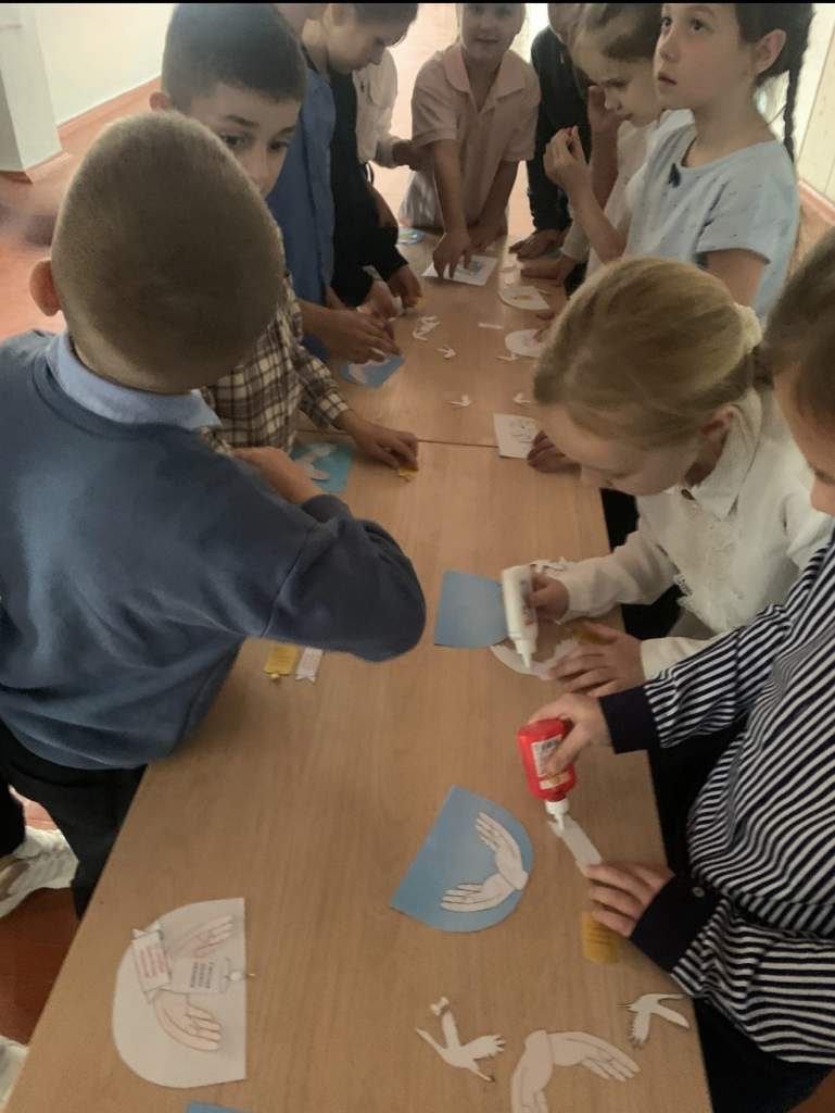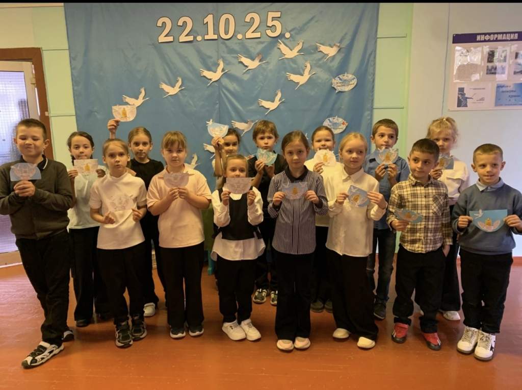 В этот день школьные стены украсили более ста белых журавлей — символов мира и скорби. Атмосфера наполнилась уважением и размышлениями о цене мирного неба над головой.