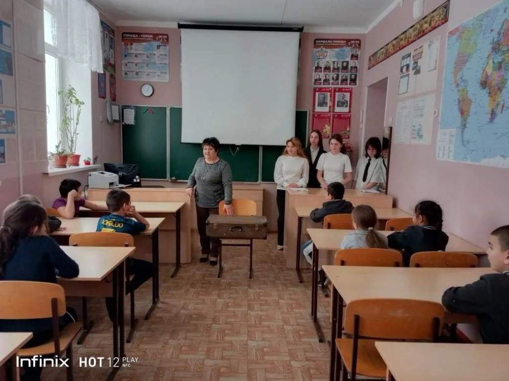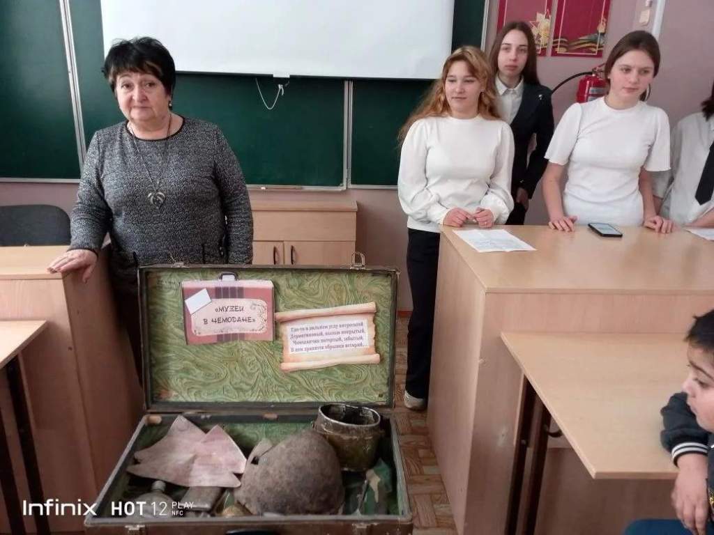 В школе №7 х. Новоселовка прошла необыкновенная акция, которая на время превратила обычный класс в настоящую машину времени. Учитель истории и руководитель школьного музейного уголка «Наследие», Черкасская Елена Николаевна, провела акцию под названием «Музей в чемодане».