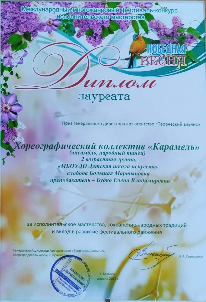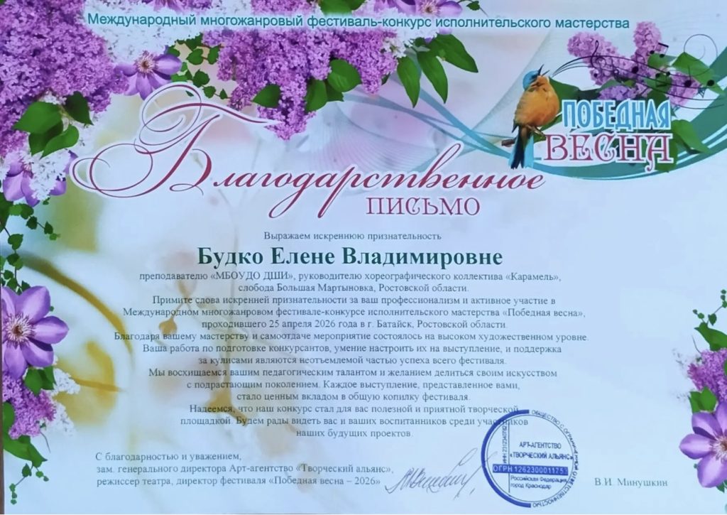 - Благодарственное письмо от организаторов вручено преподавателю детской школы искусств — Будко Е.В., которая вложила в победу своих воспитанниц душу и годы упорного труда.