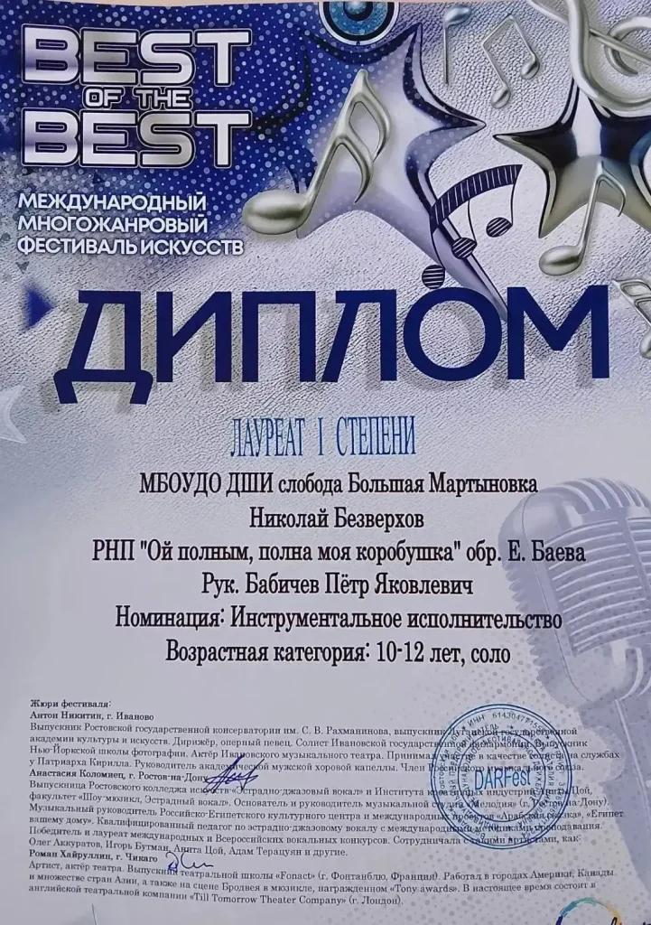 Ученик Детской школы искусств (ДШИ) сл. Большая Мартыновка, Коля Безверхов, вновь доказал, что талант и упорный труд ведут к самым высоким достижениям. 4 апреля 2026 года в городе Батайск завершился Международный многожанровый фестиваль искусств «BEST of the BEST», где Коля Безверхов выступил в номинации «гитара соло» и заслуженно завоевал звание лауреата 1 степени.