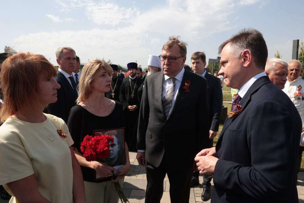 На траурную церемонию прибыла семья красноармейца. Они выразили признательность поисковой группе и местному правительству за шанс с почестями захоронить своего героя. Временно исполняющий обязанности губернатора поговорил с семьей солдата и вместе с ветеранами СВО возложил цветы к памятнику.