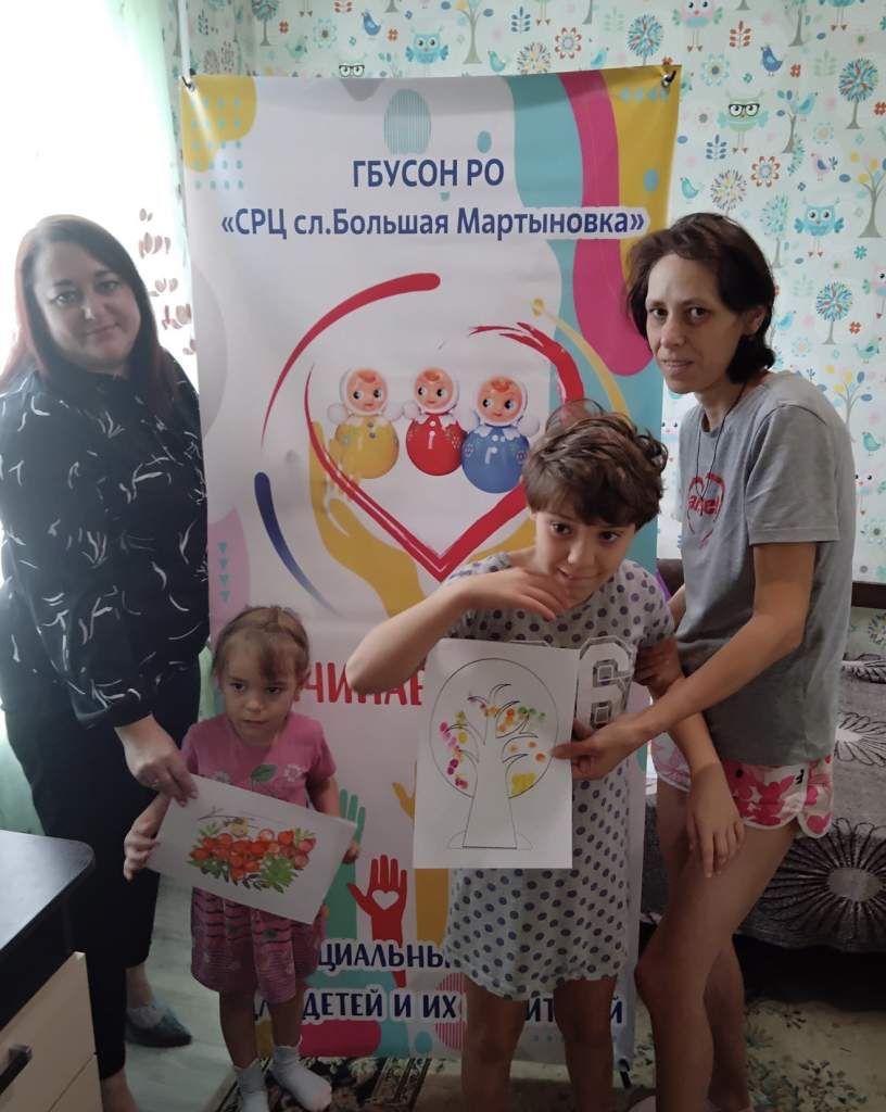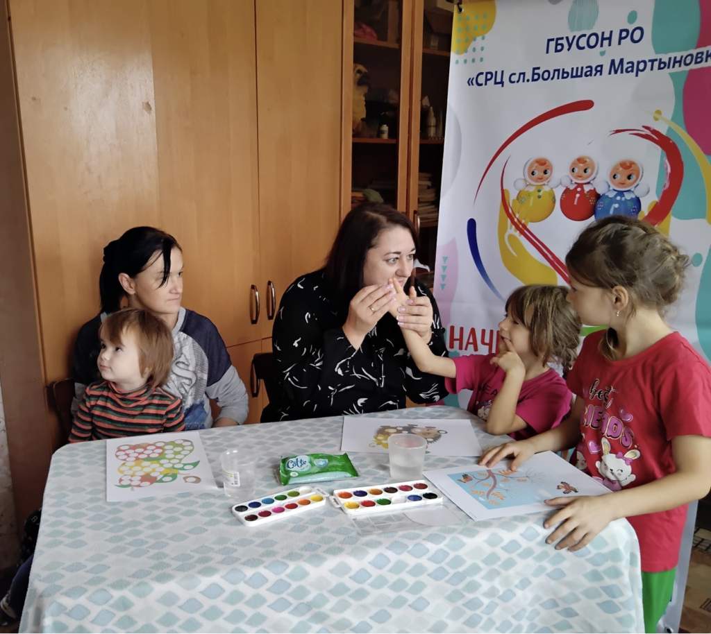 В продолжение реализации социального проекта комплексной помощи семьям с детьми «Начинаем с нуля» специалистами отделения социальной диагностики СРЦ сл. Большая Мартыновка было проведено очередное выездное мероприятие «Краски осени». Педагог отделения подготовила яркие творческие шаблоны для пальчикового рисования с малышами и их родителями. Пальчиковое рисование — это увлекательный и творческий процесс, который приносит огромную пользу маленьким художникам. По итогам занятия участники получили приятные впечатления и эмоции, потренировали мелкую моторику, что благотворно сказывается на развитии речи, внимания и памяти ребёнка Детям понравилась техника пальчикового рисования, а родители отметили важность совместного творчества, в том числе для укрепления семейных связей.