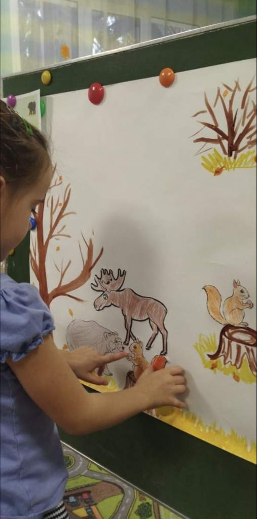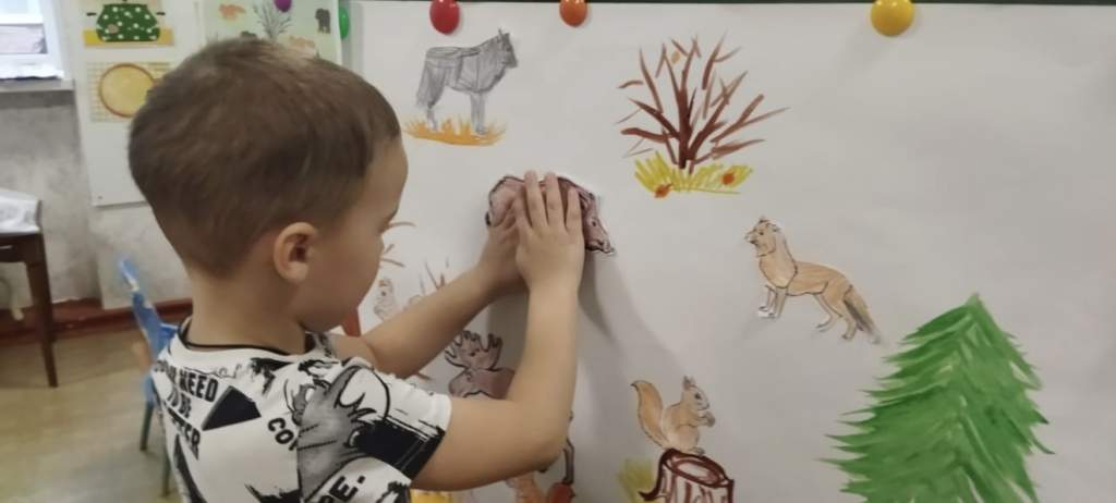 Самым увлекательным этапом стала аппликация на общем фоне. Ребята с удовольствием приклеивали своих лесных героев, создавая живописную картину осеннего леса. Параллельно с этим дети активно использовали языковые навыки: расширяли словарный запас, учились составлять простые предложения, описывая своих животных и рассказывая об их жизни в лесу.