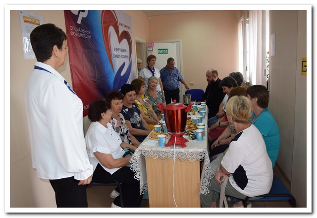 Общение продолжилось за чайным столом. Посетители задавали интересующие вопросы, делились впечатлениями. Один из самых актуальных вопросов — это график работы Центра. Специалист отделения СФР Галушко Е.И. проинформировала о том, что занятия доступны гражданам в рабочие дни: понедельник — четверг с 8:00 – 18:00, пятница — с 8:00 – 16:45. Центр находится по адресу: сл. Большая Мартыновка, ул. Советская, 84 а.