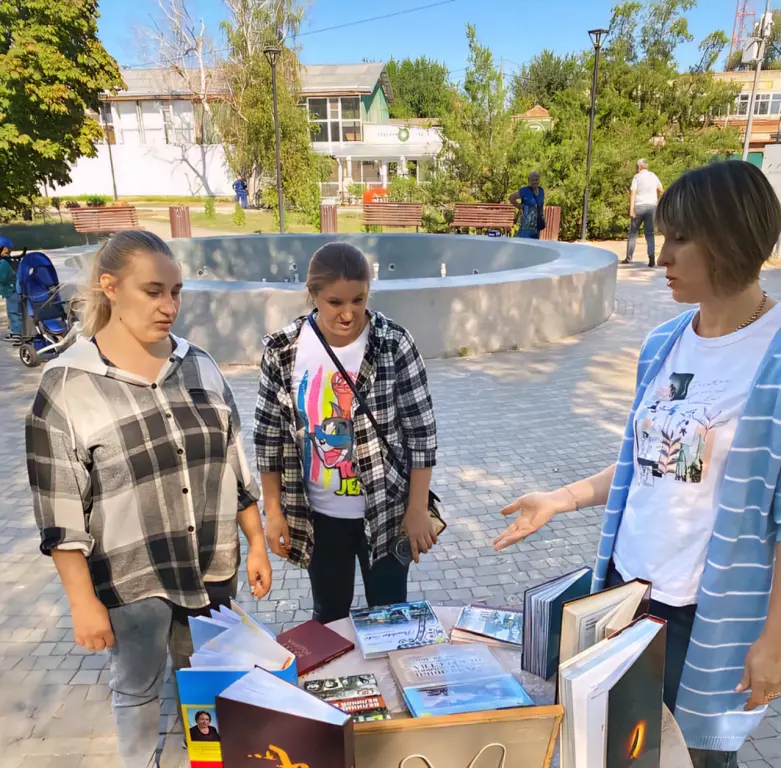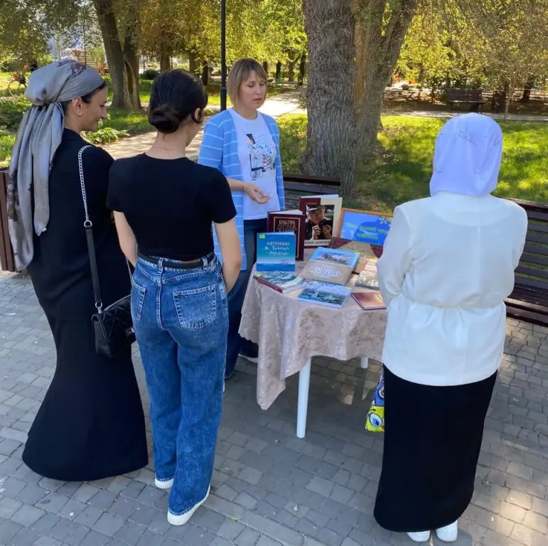 В парке им. Красных партизан сл. Большая Мартыновка работник библиотеки Кузьменко Т.Г. провела краеведческий обзор «Про отчий край спроси у книги» у тематической выставки.