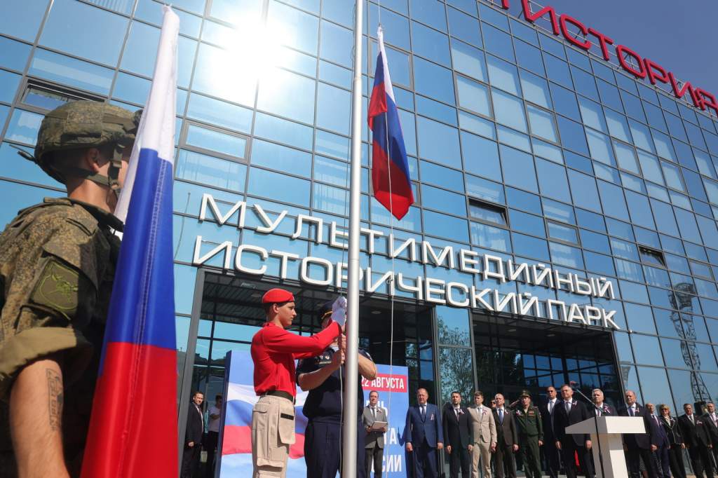 На площади перед мультимедийным центром был развернут огромный, 60-метровый российский триколор. Рядом развевались флаги с автографами командиров подразделений, принимавших участие в специальной военной операции и освобождавших территории ДНР и ЛНР. Эти флаги, по словам главы региона, являются символом отваги, мужества и непоколебимости российских военнослужащих.